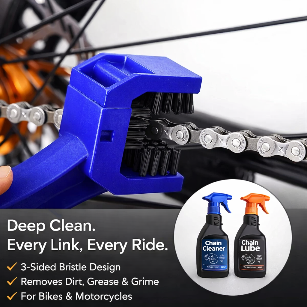 Keep your bike performing at its best with this complete Chain Cleaner, Lubricant & Brush Combo (Pack of 3). Designed to remove dirt, reduce friction, and protect against rust, this kit ensures a smoother, quieter, and longer-lasting ride.