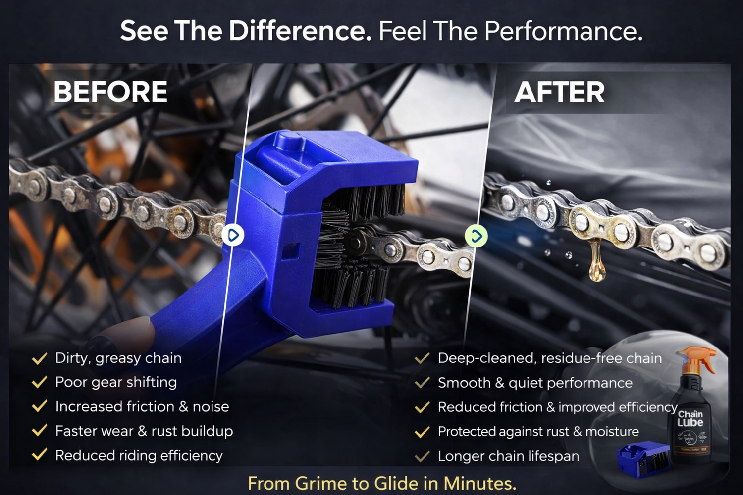“Smooth ride instantly!” I cleaned and lubed my bike chain in under 15 minutes and the difference was noticeable immediately. No more noisy chain while riding. Definitely worth the money.